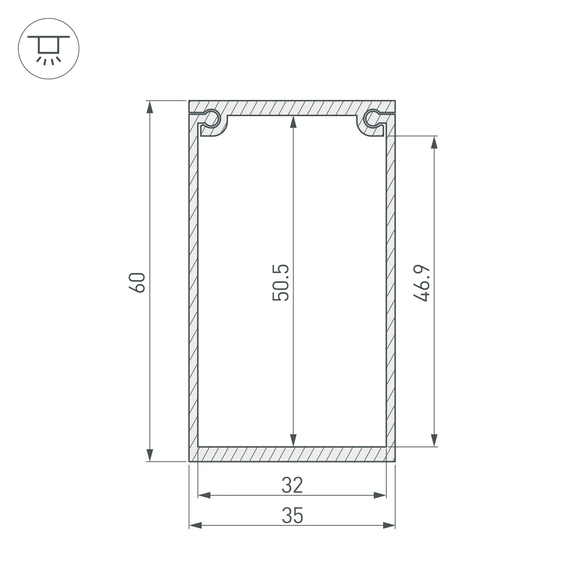 Короб для размещения блока питания для подвесного монтажа профиля. Крепится к потолку. В комплекте: Короб-1шт., заглушки-2шт. Внутренние размеры: 567×32×46.9мм. Внешние размеры: 570×35×60мм.
