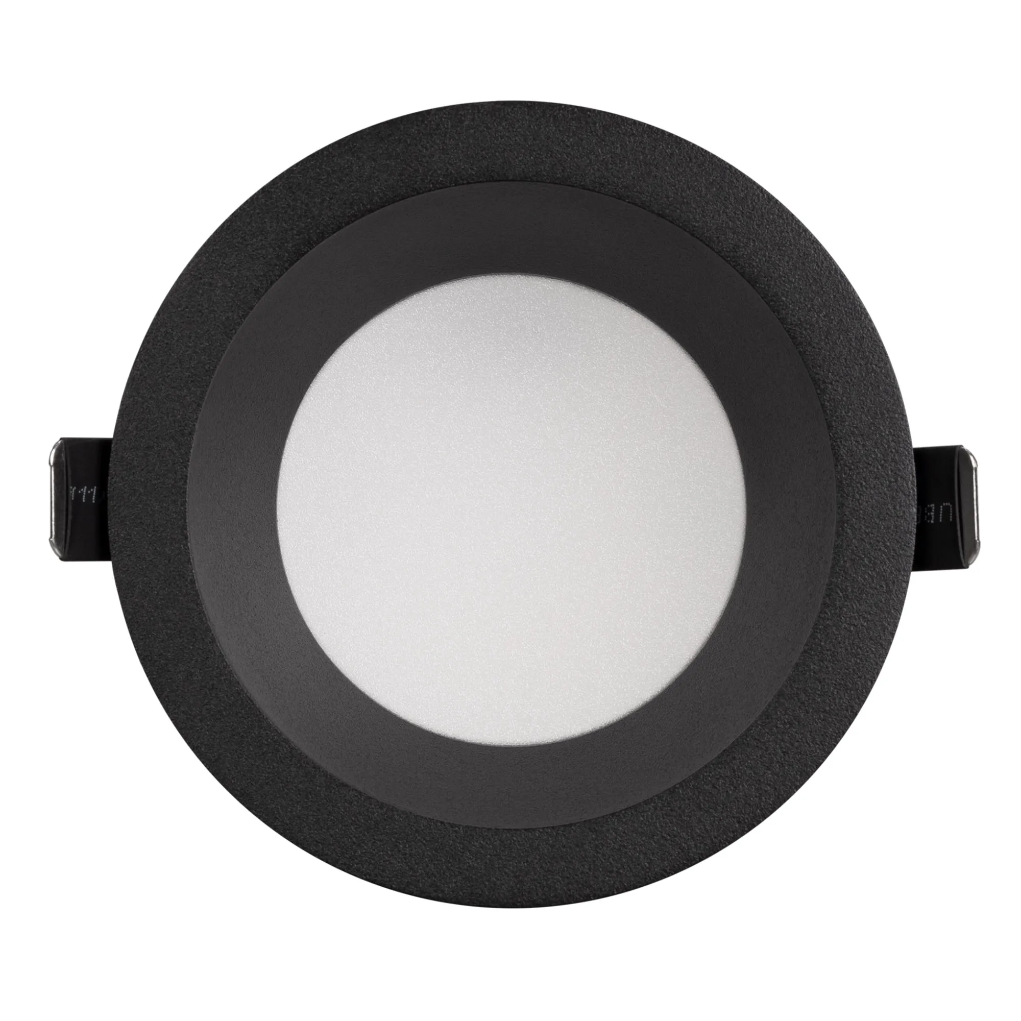 Встраиваемый светильник даунлайт. Мощность 14 Вт, св. поток 1170 лм, 83 лм/Вт, тёплый 2700 K, CRI>90, угол 85°, напряжение питания 230 В. Чёрный круглый корпус из алюминия, степень защиты IP54. Размер: диаметр 105 мм, высота 58 мм. Монтаж встраиваемый, установочное отверстие: диаметр 95 мм. Драйвер 26-42 В, 350 мА, пульсация <2%.