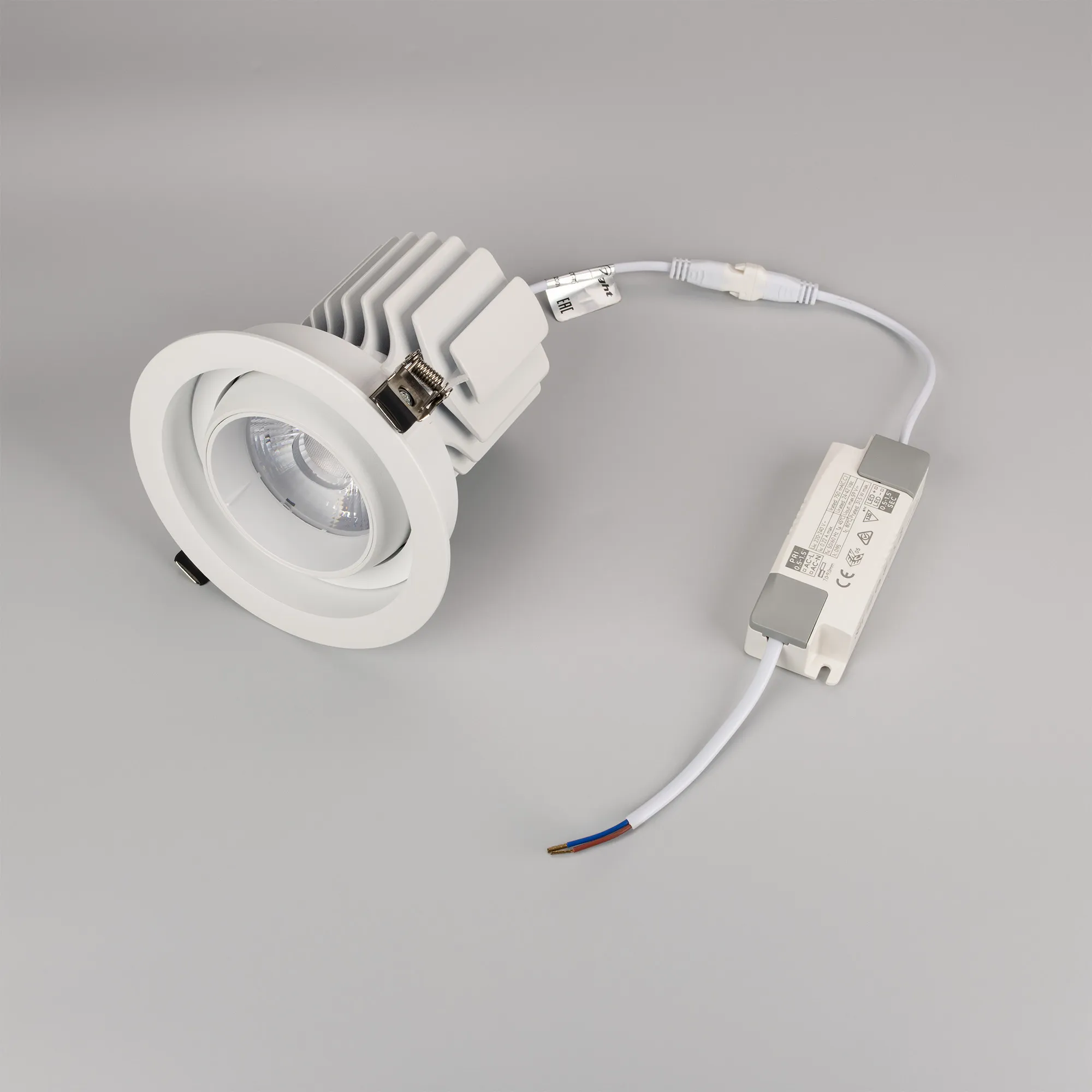 Встраиваемый карданный светильник. Мощность 30 Вт, св. поток 3104 лм, 102лм/Вт, дневной 4000 K, CRI>92, угол 17°, напряжение питания 230 В. Белый корпус из алюминия, белая вставка, степень защиты IP20. Размер: диаметр 135 мм, высота 125 мм. Монтаж встраиваемый, установочное отверстие: диаметр 120 мм. Драйвер 24-42 В, 750 мА, пульсация <2%.
