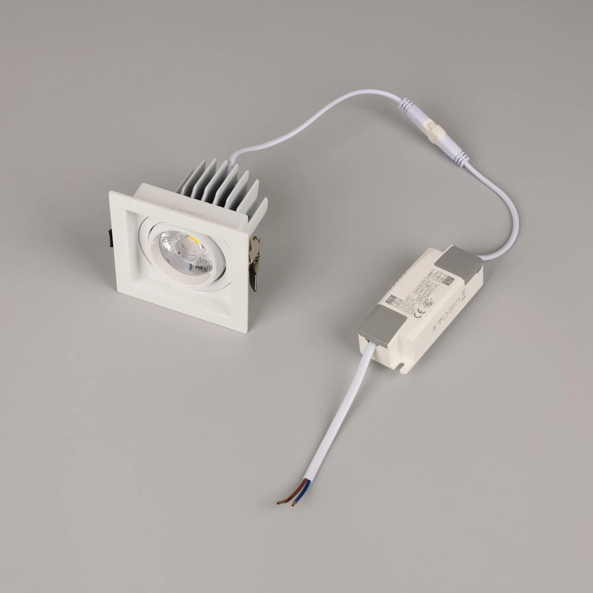 Встраиваемый карданный светильник. Мощность 12 Вт, св. поток 1318 лм, 109 лм/Вт, дневной 4000 K, CRI>92, угол 20°, напряжение питания 230 В. Белый корпус из алюминия, белая вставка, степень защиты IP20. Размер: длина 90 мм, ширина 90 мм, высота 80 мм. Монтаж встраиваемый, установочное отверстие: длина 75 мм, ширина 75 мм. Драйвер 27-40 В, 300 мА, пульсация <2%.